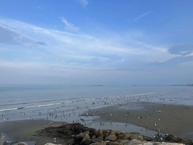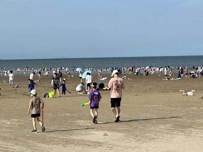 傍晚5时左右,游客已经如赶集一般,一拨拨涌来了。换上泳衣,套上救生圈,人们纷纷扑进大海的怀抱,海浪温柔地拥抱着,像母亲的手轻轻摇晃。浅浅的海面上,回响着大人、孩子们戏水的喧闹声。