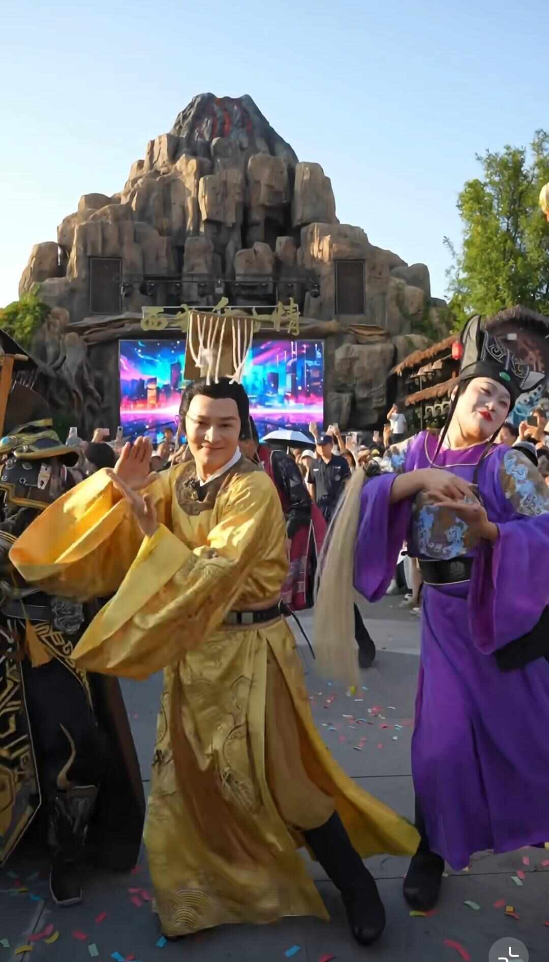 在西安千古情景区,郑国霖驾轻就熟地摆出“李世民”的经典姿态,一句“接着奏乐,接着舞”后,便与游客即兴起舞;面对游客一句俏皮的“养你啊”,他随即甩袖高喊“退朝!有人要养朕了”,逗乐全场;“玄武门”下,他更与“秦始皇”上演趣味“对战”,让历史角色有了接地气的互动。